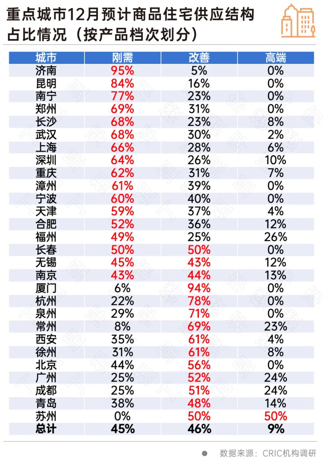 从供应结构各产品档次分布来看,重点城市刚需、改善、高端占比结构为45%、46%和9%,呈现出以刚需、改善二分天下的供应结构。