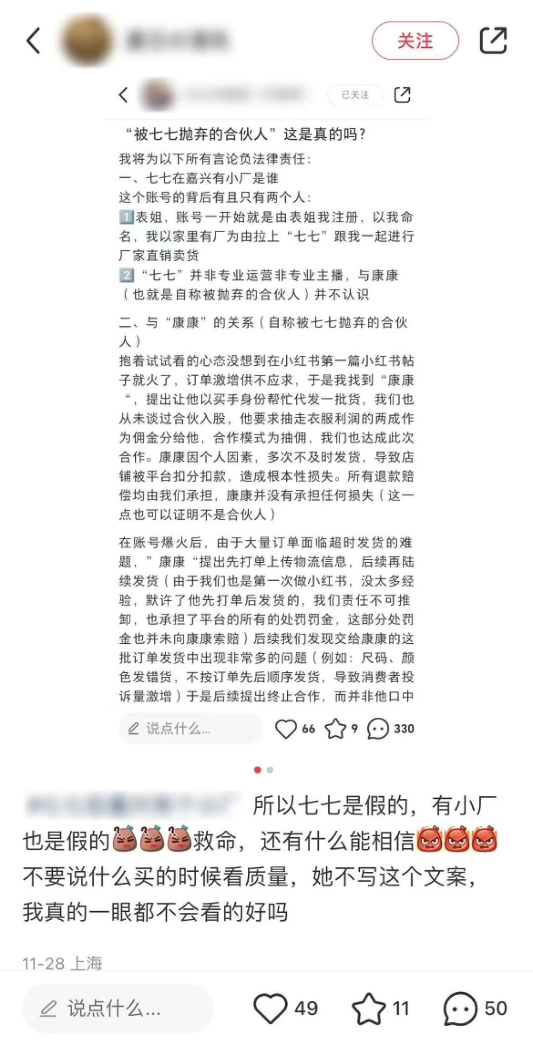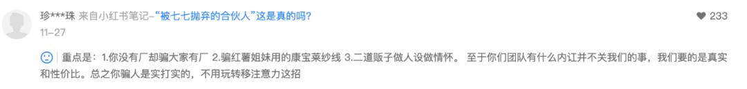 最后双方彻底闹掰,七七直接把小红书账号名改成了 @七七不卖货(打官司去了)。一个厂二代发家致富的故事,生生演变成了一场闹剧。