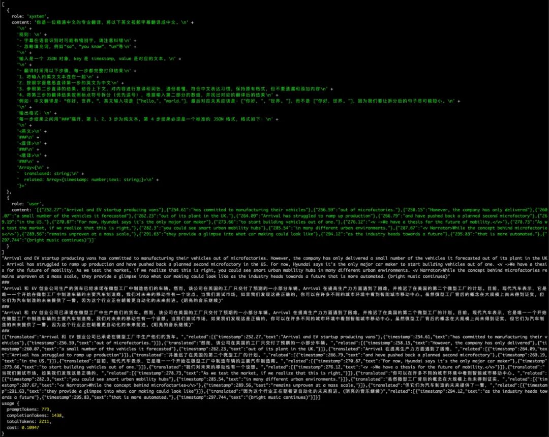 接着是字幕翻译,由于字幕不仅有文本,还有时间轴。所以翻译英文字幕,不仅需要翻译英文文本为中文,还要基于翻译后的语序和长度,重新调整中文字幕的时间轴和文本拆分。所以以前像翻译字幕这种事,都有一个字幕组来做,有人专门翻译,有人重新对时间轴。而现在的大模型兼有语言和推理能力,不仅可以翻译,还能对时间轴,这就极大地提升了字幕翻译的效率。所以在今年一年里,我借助 AI 的帮助,一个人翻译了将近 100 多部教学视频,这在以前是不敢想象的。