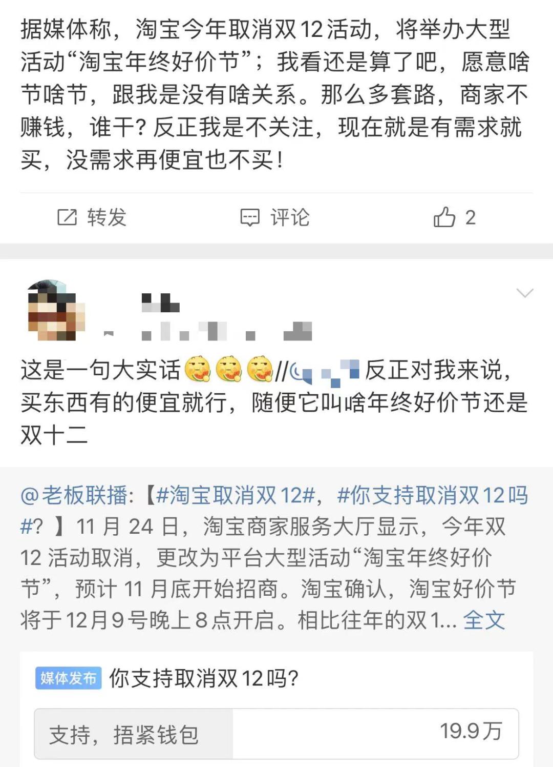 简而言之,促销活动换叫法是“面子”功夫,如何把“里子”做出心意,给消费者带来实惠,才是重中之重。倘若淘宝能做到平价好货,无论是双12还是淘宝年货节,消费者照样愿意买单。不过目前社交平台中有很多网友表示,淘宝天猫的年终好价节只是“新瓶装旧酒”。
