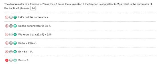 每一步都有一个绿色笑脸符号,代表该步骤处于正确的思路之上,直到最后一步模型得出“x=7”,这时打出的是红色的皱眉符号。