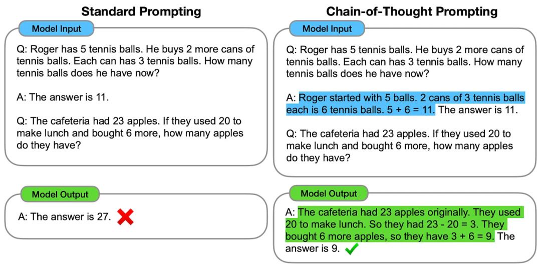 这篇论文的发表时间还早于“零样本”提示技术,因此研究人员通过给出示例答案的方式来提示模型。在左图中,系统会提示模型直接给出最终答案,但结果是划的。而在右侧,系统会一步步提示模型并最终推理出正确答案。谷歌研究人员将这项技术称为“思维链提示法”,且至今仍被广泛应用。