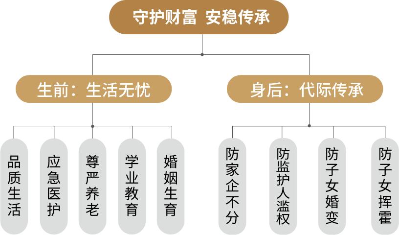 在服务实践中,我们梳理出私人银行客户在“守护财富、安稳传承”中的共性诉求:生前满足生活无忧,身后做到代际传承。通过投资产品+保险产品的合理配置可以实现生活无忧的各项诉求,然而无法解决客户代际传承的三大需求痛点:一是投资积蓄/保险金能否顺利交到继承人/受益人手上?特别是继承人或保险金受益人是未成年人、身心功能障碍者、老年人或者无行为能力者时,这些弱势群体继承后往往不能完全享受巨额资金带来的利益,还存在监护人代为操控、挪用资金的风险;二是继承人或保险金受益人能否有效规划使用资金?如在获得资金后肆意挥霍或投资不利而导致资金被过快消耗的风险;三是怎样规划安排才能避免财富多代传承中子孙辈可能面对的各项传承风险?如家企混同导致的债务风险、子女婚变造成家产外流风险以及因家庭关系较为复杂引发的传承反目纠纷等。