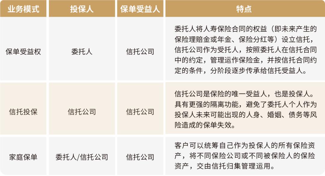 从保险产品适用类型上看,目前业界通常选择终身寿险和大额年金保险设立保险金信托,这主要是因为这两个险种更契合保障传承的目的。从业务模式选择上看,保单受益权模式为主流选择,综合了保险和信托的优势,解决了配置大额保单后赔付金滥用风险。信托投保模式为次要选择,利用信托财产的独立性,更好地实现资产保护,避免投保人身故后保单作为遗产被分割或者作为投保人财产被强制退保等风险,满足更多高净值客户的资产保全与传承的需求。家庭保单模式则方便客户归拢自己作为投保人的所有保险资产,将不同保险公司或不同被保险人(家庭成员)的保单资产交付信托公司实现归集与统筹运作管理。