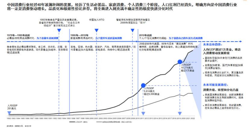 中国消费行业经过40年波澜壮阔的发展,经历了生活必需品、家庭消费、个人消费三个阶段,进入到了充满不确定性的极度快速分化时代。而中国特色的诸多因素交叉复合奠定了中国消费市场韧性基础,进一步催生了复杂性和不确定性,时至今日, 中国消费企业从未经历过如此迅猛变化的外部环境。 其中明确的是中国消费行业将一定是消费驱动发展,不确定的是当高端品质化和极致性价比的消费分化同时并存时,对于每个现有企业充满挑战、而对行业新进入者满是机会,面对消费行业演化新格局, 我们需要洞见未来,积极拥抱转型。