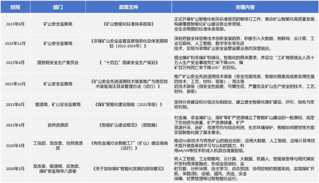 2022年8月,应急管理部、国家矿山安全监察局发布的《“十四五”矿山安全生产规划》指出,要加强矿山智能化关键技术的研发,辅助运输环节无人驾驶等在内的关键技术和装备的突破重点; 推动无人少人智能化示范矿山建设。