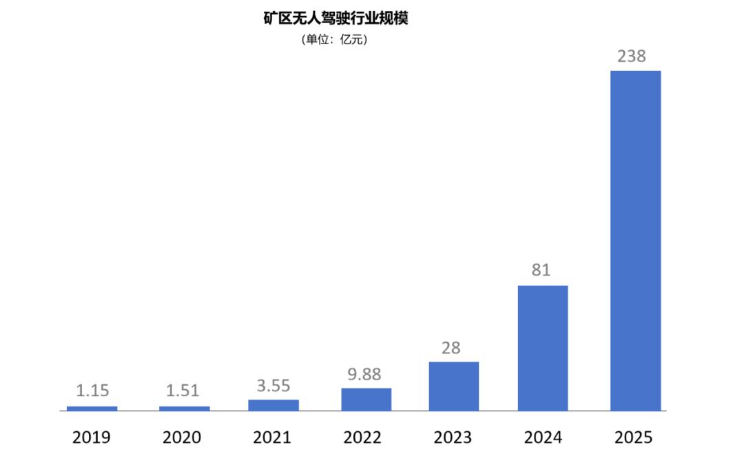 从商业逻辑上看,任何技术想要大规模商业化落地,实现经济利益闭环,都需要有广阔的市场做支撑。以2020年数据测算,我国露天煤炭、砂石矿、铁矿的每年运输规模分别为336亿元、1880亿元、104亿元,无人驾驶的潜在市场空间为每年2320亿元;但我国矿山无人驾驶市场渗透率目前比较低。据行业测算,2021年矿区无人驾驶行业规模不足4亿元,但近年来复合增长率将超过100%,2025年将突破200亿元,未来可破千亿大关。矿区无人驾驶明显在高速发展的快车道上。