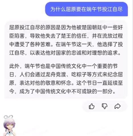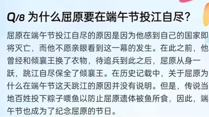 我只能说不愧是在“弱智吧”进修过的AI,淘宝问问的回答显然是跳出了语言陷阱,发现了端午节是为了纪念屈原才设立的事实,并给出了逻辑清晰的回答。