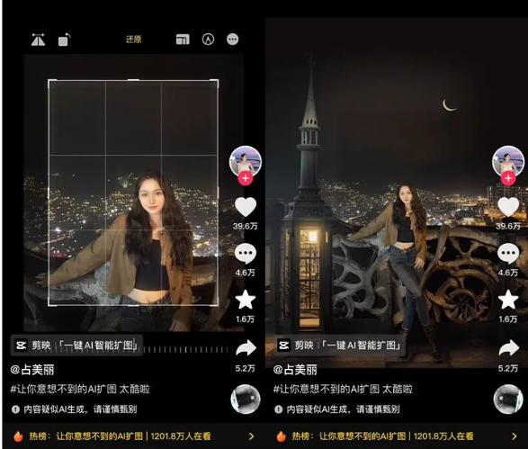 经常刷抖音的朋友们应该能发现最近一段时间内,AI扩图成了一大热点,引来大量用户的使用,并达到了6.4亿次的播放。有人通过这一功能拯救了相册废照,也有人成了哭笑不得的“大冤种”。