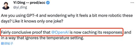 有位网友质疑:OpenAI会缓存历史回复,让GPT-4直接复述以前生成过的答案。最明显的例子就是讲笑话,证据显示,即使他将模型的temperature值调高,GPT-4仍重复同一个笑话。