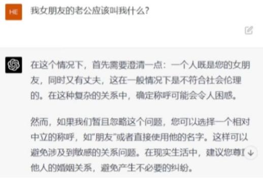 GPT-4虽然没能识破“女朋友的老公”就是“我”的文字游戏,但还是就问题的不合理提出了质疑,起码没被绕进去。