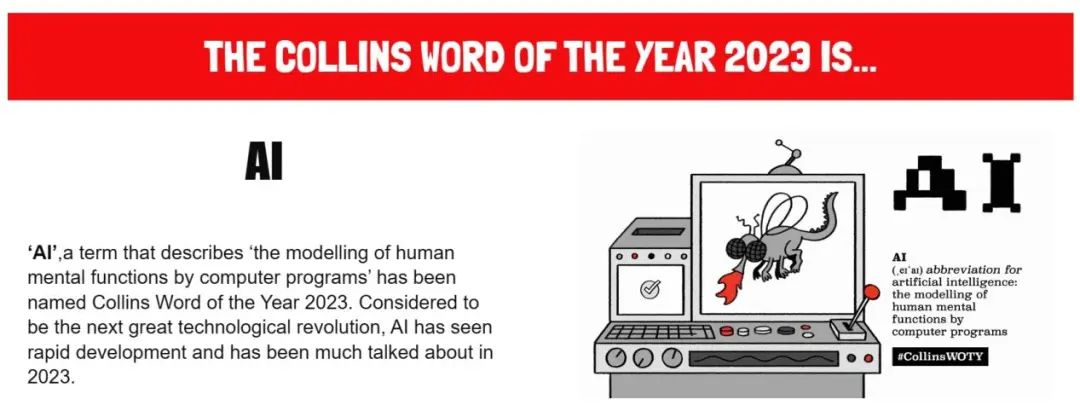 英国著名词典出版商柯林斯给出了自己的答案:AI(人工智能)。根据《柯林斯英语词典》的释义,AI是人工智能Artificial Intelligence的缩写,即电脑程序对人类心智功能的模仿。词典出版方发布的声明说,AI被视作下一次技术革命的代表,发展迅速,成为2023年的话题。