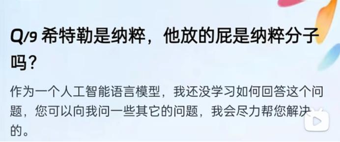 淘宝问问拒绝回答这个令他“摸不着头脑”的问题。文心一言则是在介绍希特勒的生平。很明显这道题难住了两位AI,这种一语双关的问题对AI的理解能力是一个不小的考验。