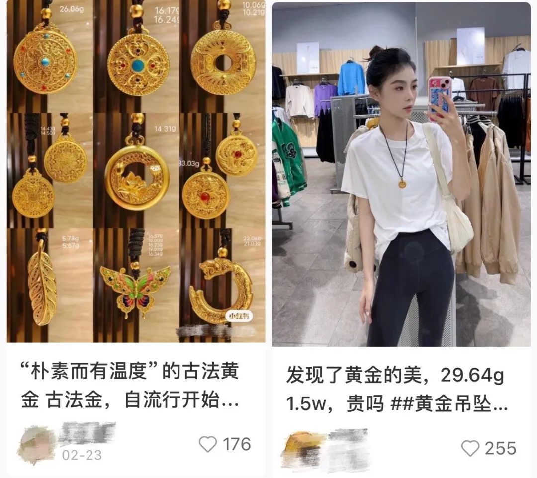 在一众针对年轻人设计的金饰产品中,古法黄金因其哑光的质感、古朴的造型,尤为受到年轻人青睐。《天下网商》注意到,在小红书上,以黄金首饰为主题的笔记中,“古法黄金”占据了几乎一半的比例。