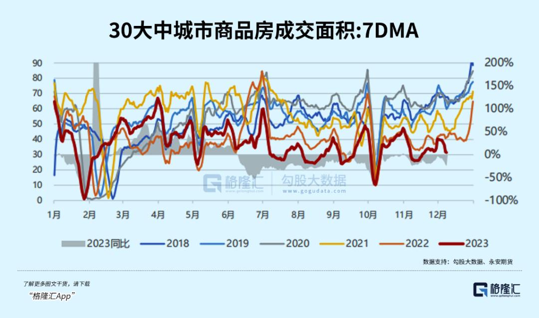 据永安期货,上周30大中城市商品房成交环比再度回落,同比2022年仍然是下滑的,且处于多年来同期最低水平。另外,上周100大中城市土地成交面积环比上涨,略高于2021年,但全年土拍多数时候均处于多年低位。