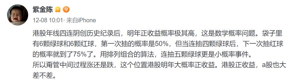 被写作耽误了的股神“紫金陈”于近日发帖表示,这个位置港股明年大概率正收益。港股正收益,A股也大差不差。