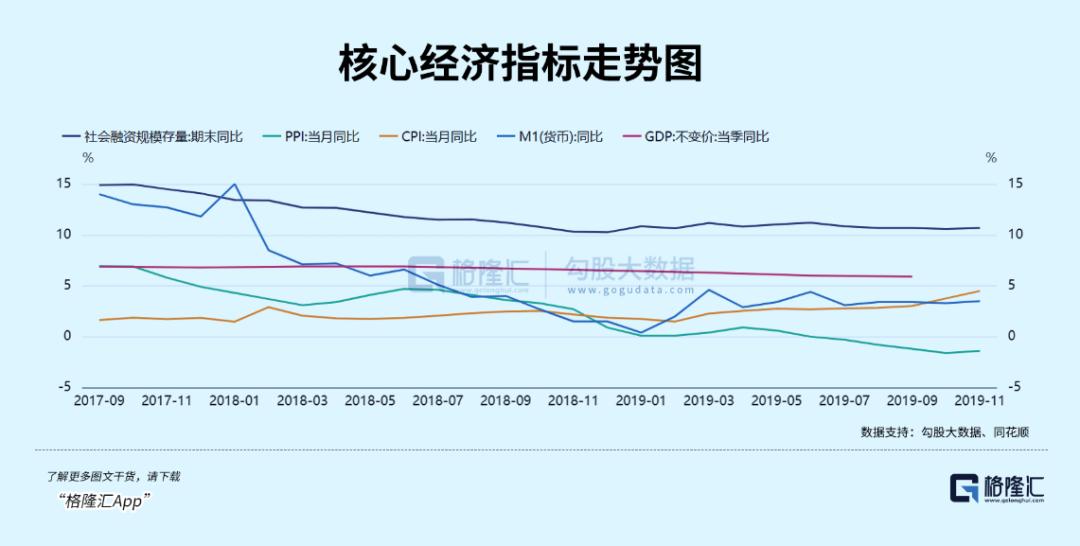 2018年,季度GDP增速分别为6.9%、6.9%、6.7%、6.5%。M1增速从15%持续下滑至12月的1.5%。此外,社融、PPI等宏观指标也持续下滑。