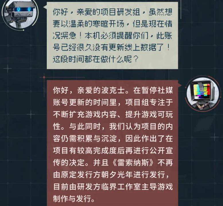 而《雷索纳斯》也于昨日(12月11日)发布公告称,游戏不再由朝夕光年发行,目前由玉尊软件旗下临界工作室主导游戏制作与发行。