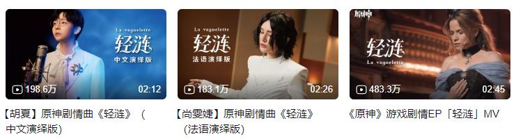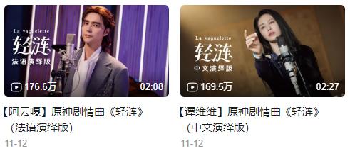 除了腾讯,同在11月,同为顶级游戏厂商,米哈游的《原神》发布了被称为“水神劈观”的《轻涟》,《逆水寒》手游则发了《龙吟》推广曲。