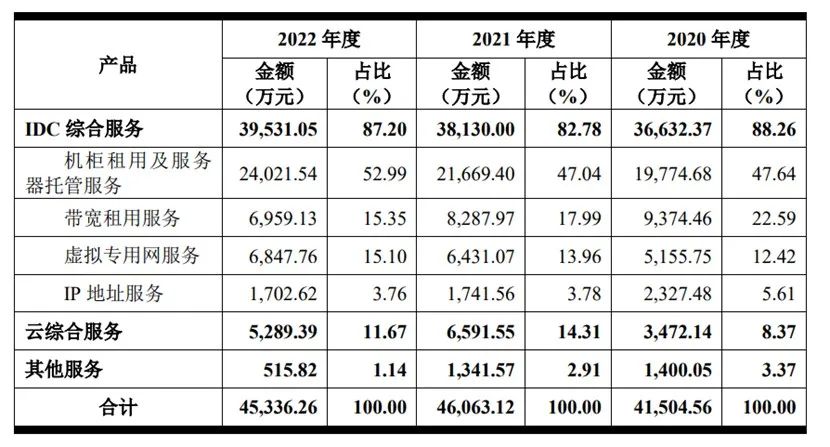 其中,包括机柜租用及服务器托管服务、带宽租用服务、IP 地址服务、虚拟专用网服务等IDC综合服务是发行人主营业务收入的主要构成部分。招股书显示,2020年、2021年、2022年,尚航科技IDC综合服务实现的收入为3.66亿元、3.81亿元及 3.95亿元,占公司主营业务收入的比重分别为 88.26%、82.78%及 87.20%,是公司的主要收入来源。