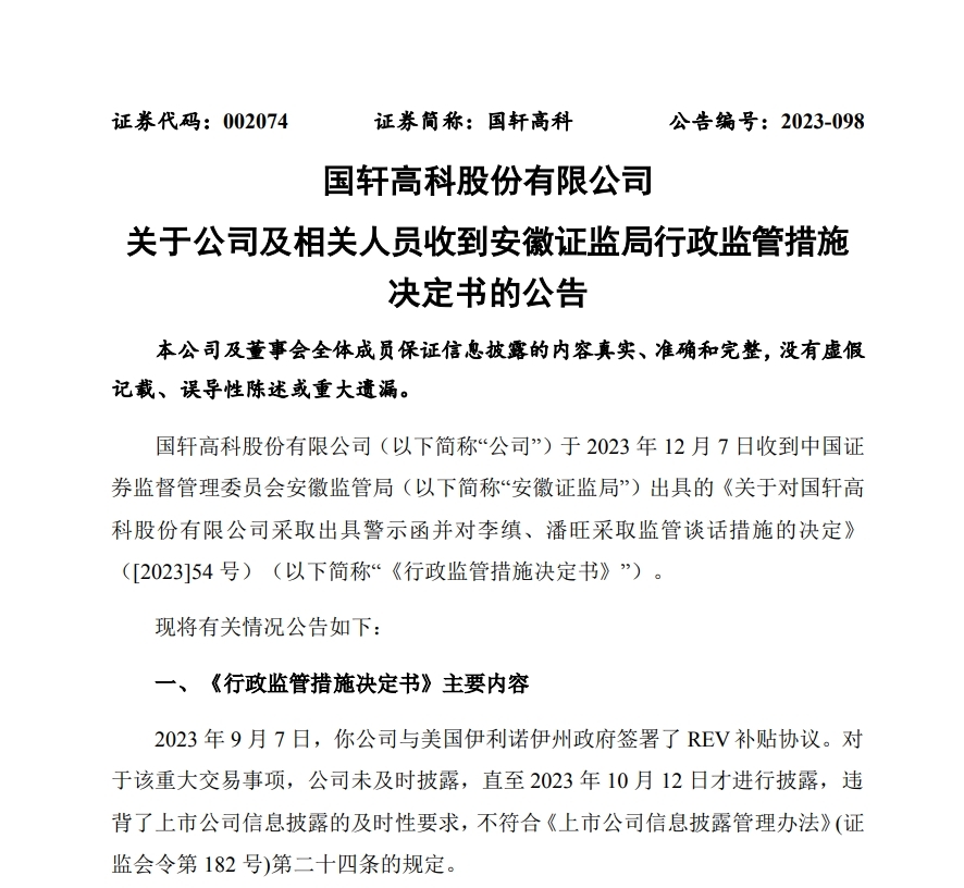 而根据此次公告内容,由于国轩高科董事长李缜直接参与了与美国伊利诺伊州政府签署协议的相关工作,董事会秘书潘旺作为公司信息披露事务的具体负责人,证监会对李缜、潘旺采取监管谈话的行政监管措施,并记入证券期货市场诚信档案。