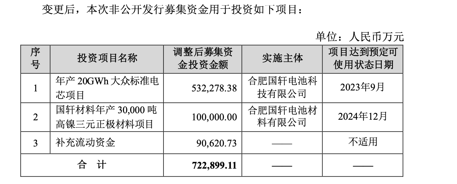 公开资料显示,2021年国轩高科通过向战略投资者大众汽车(中国)投资有限公司非公开发行股票方式,实际募集到约为72.31亿元资金净额,用于电池生产。2022年4月,国轩高科董事会议同意将募投项目“国轩电池年产16GWh高比能动力锂电池产业化项目”变更为“年产20GWh大众标准电芯项目”,截至11月30日,该项目已投入使用约36.13亿元资金。