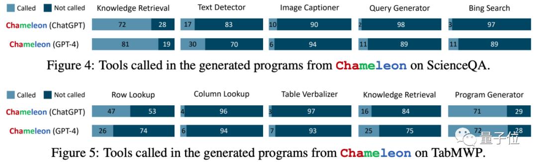 例如,在回答ScienceQA的科学问题时,GPT-4更频繁地调用“知识检索”,并且相对ChatGPT更频繁地调用“Bing搜索”(11% vs. 3%)。