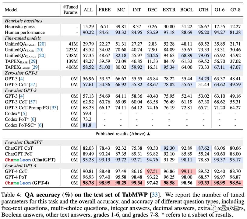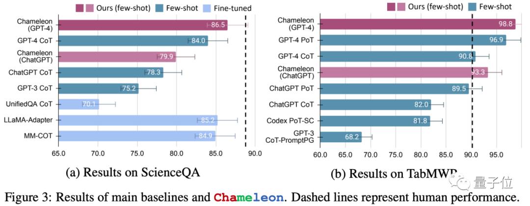 同样地,Chameleon在TabMWP数据集上实现了98.8%的准确率,领先最先进模型17.0%的性能。