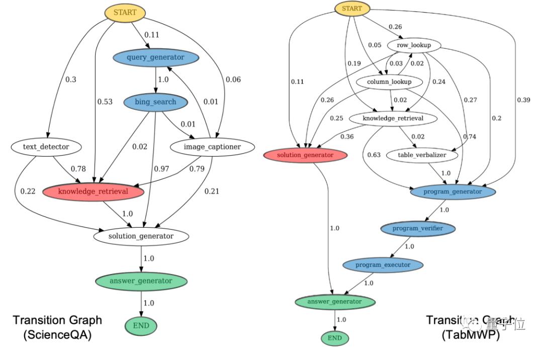 对于ScienceQA任务,特定领域的工具,如“必应搜索(Bing Search)”和与视觉相关的工具,起到了关键作用,而在TabMWP任务中,常用的“程序生成(Program Generator)”模块对最终性能的影响也非常显著。