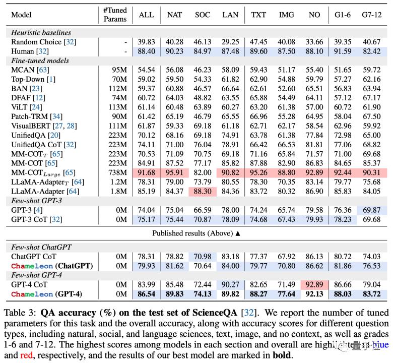 在ScienceQA任务中,Chameleon模型与GPT-4合作,实现了86.5%的准确率,是当前最优秀的few-shot模型。