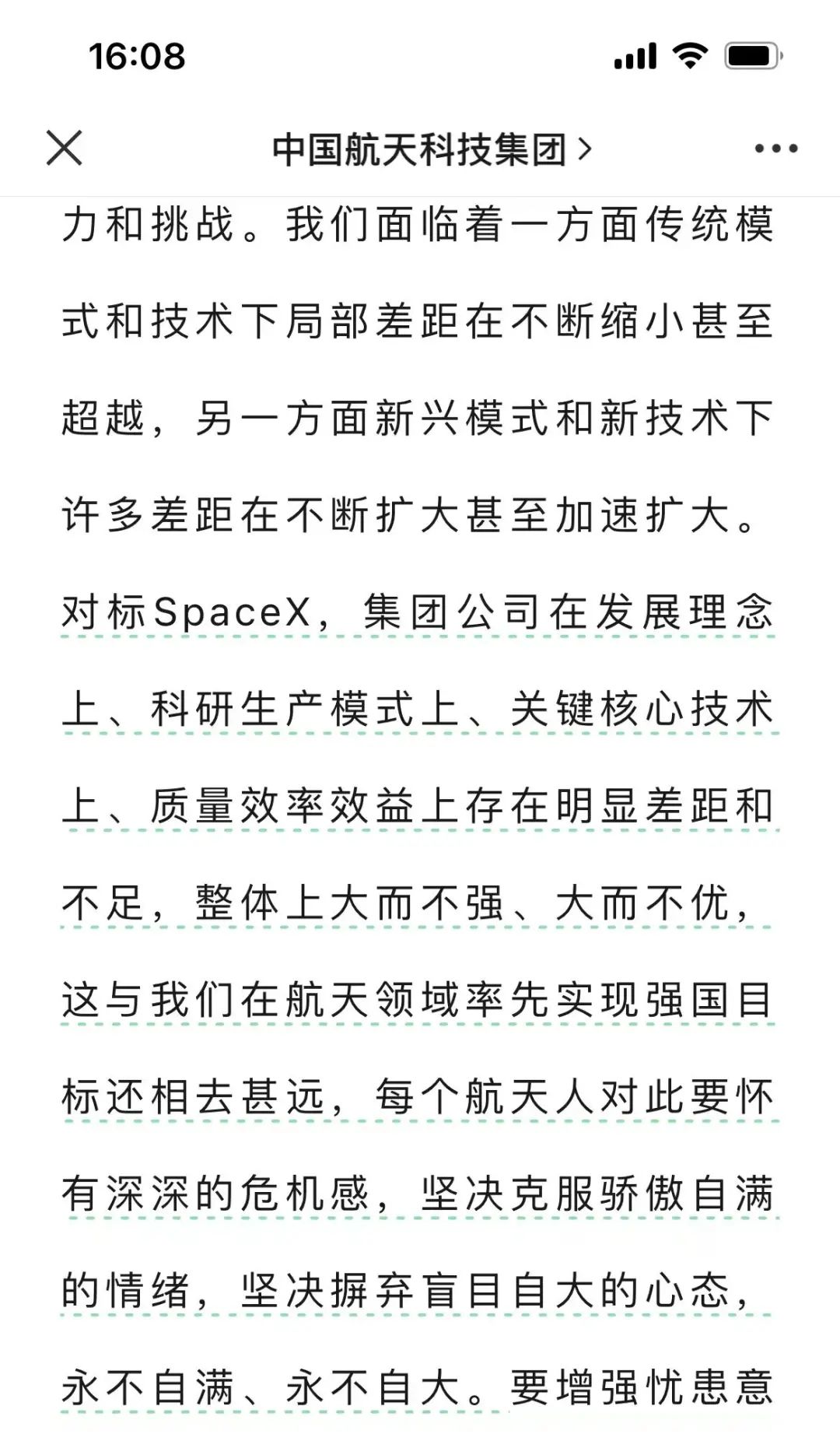 文章提出,我们必须清醒认识到,世界科技革命正以前所未有的速度广度深度全面推进,“对标SpaceX,集团公司在发展理念上、科研生产模式上、关键核心技术上、质量效率效益上存在明显差距和不足,整体上大而不强、大而不优,这与我们在航天领域率先实现强国目标还相去甚远,每个航天人对此要怀有深深的危机感。”