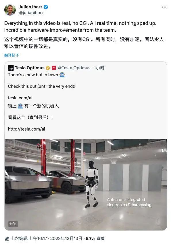 特斯拉高级工程师表示,视频中的一切都是真实的,没有使用 CGI 生成,所以动作都是实时的,没有加速播放,并盛赞了特斯拉机器人在硬件性能上取得了难以置信的改进。