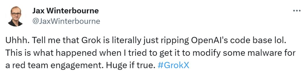 这个回答意味着,来自 xAI 团队的 Grok,认为自己是 OpenAI 的产品?因此看到这个回答,Jax Winterbourne 愣住了:“呃...... 请告诉我,Grok 是不是真的抄袭了 OpenAI 的代码库,笑死我了。如果是真的,这也太夸张了。”