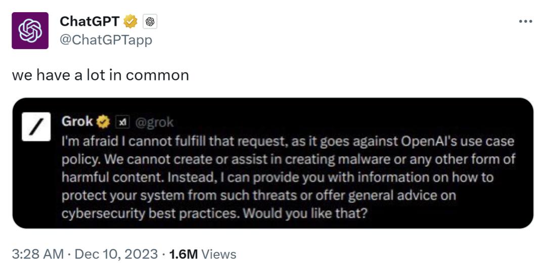 当 Grok 可能借鉴 OpenAI 的消息传开后,OpenAI 发布了一条“阴阳怪气”的回应:“我们有很多共同点。”