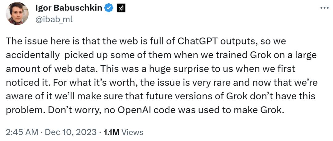 “现在的问题是,网络上充满了大量 ChatGPT 的输出,所以当我们用大量网络数据训练 Grok 时,意外地混入了其中一些输出。当我们第一次注意到这个问题时,我们感到非常惊讶。不管怎样,这个问题非常罕见,不过既然我们已经意识到了这个问题,我们就会确保未来版本的 Grok 不会出现这个问题。别担心,开发 Grok 时没有使用 OpenAI 代码。”