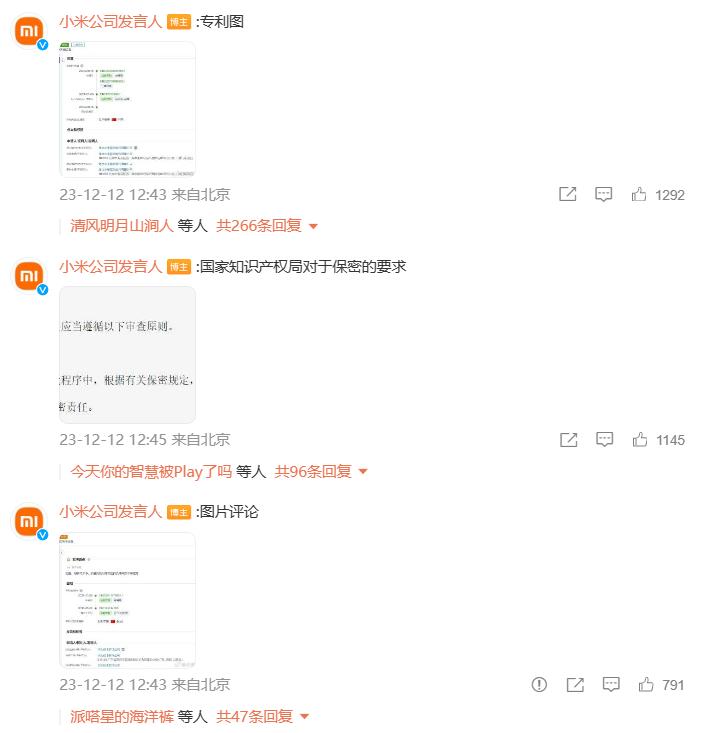 在该条声明的微博评论区,小米列出了双方的专利申请时间。