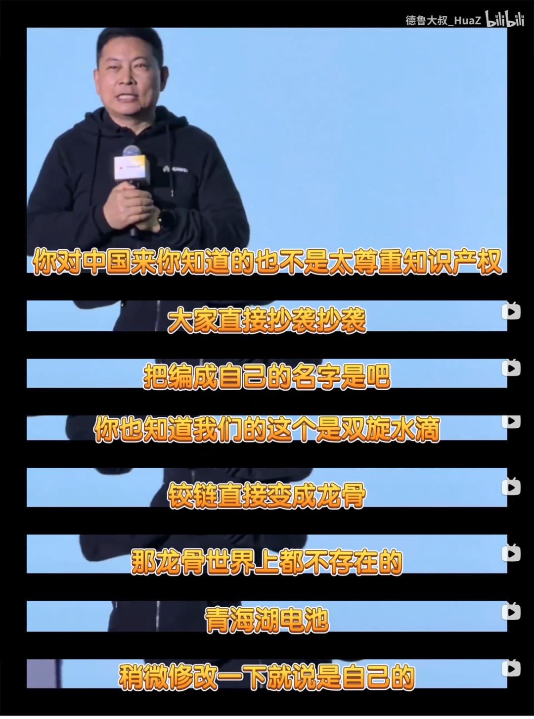 说着说着,余总突然画风一转,说到了中国不是太尊重知识版权,大家抄袭技术,将它改成自己的名字,比如把“双旋水滴铰链”变成“龙骨”,又比如“青海湖电池”……