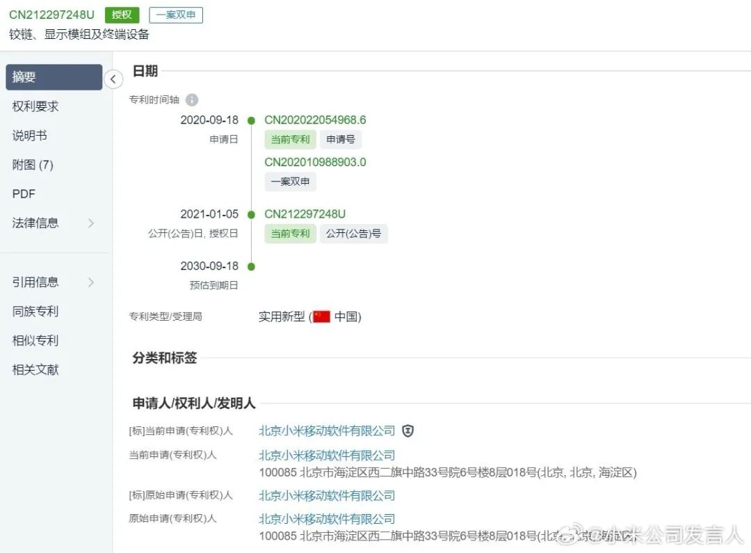 而小米的「铰链、显示模组及终端设备」(三连杆组)专利申请时间是 2020 年 9 月 18 日,也就是小米申请专利时,华为二连杆组专利还没公开。