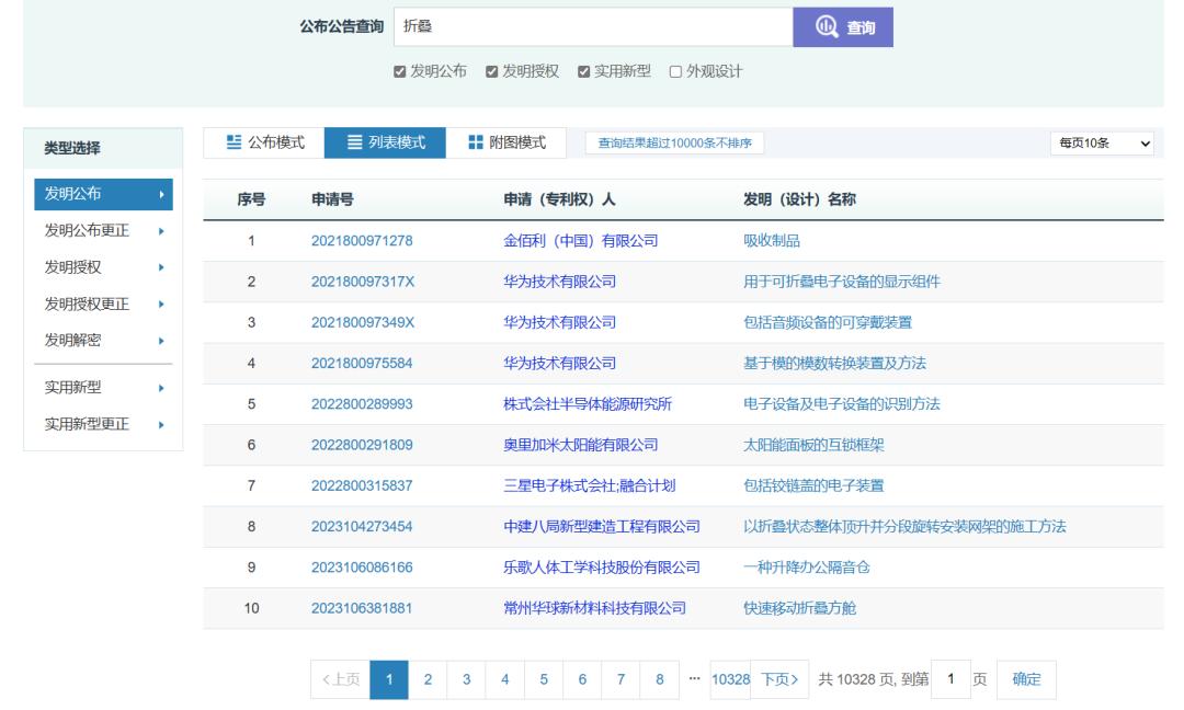至于华为和小米各自在铰链方面有哪些专利,老狐再次本着严谨与科学的精神去国家知识产权局查找。却发现关键字无论是公司名称、还是“折叠”、“铰链”,专利数量最少都超过 1.8 万件。