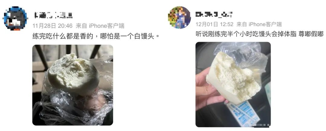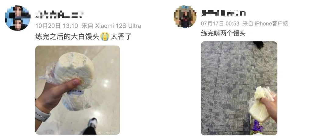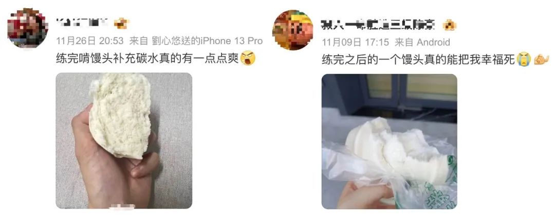 而另一边,不少健身人纷纷长出「碳水脑袋」,每日训练结束后第一时间掏出包里提前备好的大白馒头啃得心满意足。
