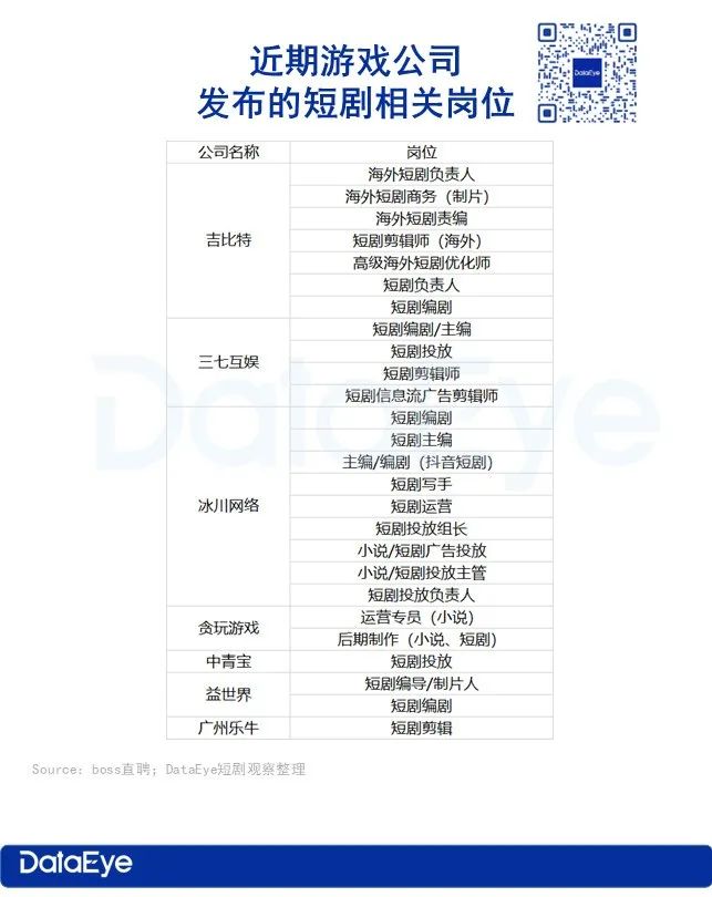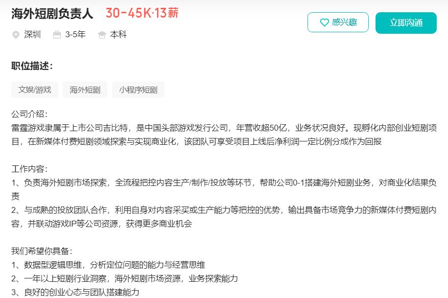 Boss直聘招聘信息显示,近期三七、吉比特、冰川网络、中青宝、贪玩游戏、益世界、广州乐牛等游戏公司均在招聘短剧相关的岗位。