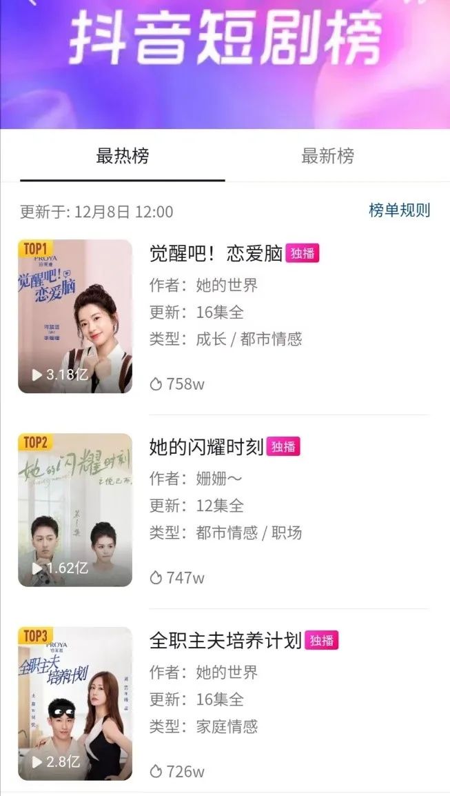 从2022年底,完美世界就开始在抖音平台试水微短剧,目前已推出五部微短剧,累计播放量超7亿。其中,近期上线的《觉醒吧!恋爱脑》、《全职主夫培养计划》分别位列抖音短剧最热榜榜首及第三名。