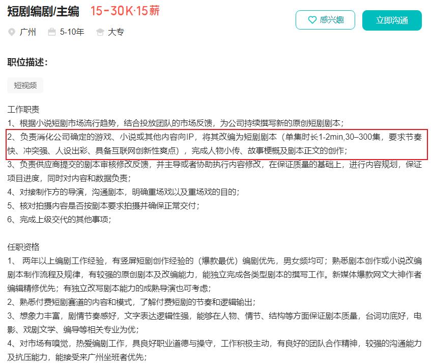 三七互娱正在招聘短剧编辑/主编,要求其负责消化公司确定的游戏、小说或其他内容向IP,将其改编为短剧剧本。