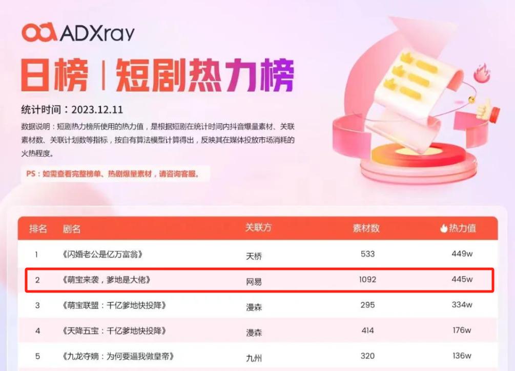 游戏巨头网易,已悄悄入局短剧。网易旗下热门短剧《萌宝来袭,爹地是大佬》近期投放量飙升,位列12月11日短剧热力榜第2名。