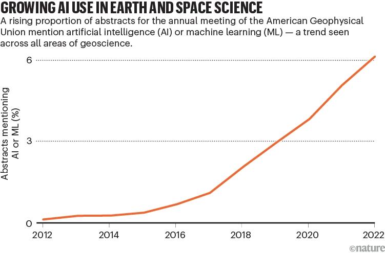 美国地球物理联盟 (AGU) 的跟踪报告进一步揭示了 AI 工具的广泛应用,从 2012-2022年,摘要中提到 AI 的论文数量呈现指数级增长,这凸显了其在天气预报、气候模拟、资源管理等方面的巨大影响。