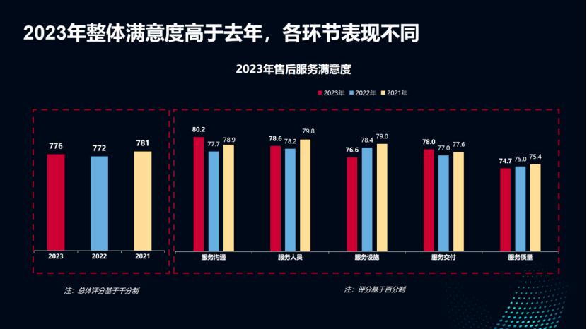 2023年售后服务满意度得分为776分,略高于去年。五大环节中,服务沟通和交付两个环节成绩在连年下降后今年均有不同程度上升,服务人员和质量环节成绩与去年基本持平,服务设施环节成绩出现较大幅度下降。