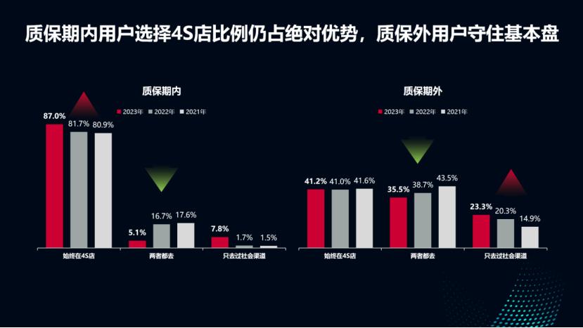 本年度报告加入新势力品牌分类,受此类品牌用户维保渠道选择影响,“始终在4S店”维保客户比例较去年略有上升,占比较2022年上升5.3个百分点;质保期外,坚持到4S店维保的用户与往年占比持平。