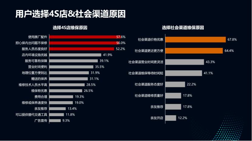 进一步研究发现,“始终在4S店维保”用户中,女性用户占比更高,首购以及21-39岁青年用户选择比例增幅较大,首购用户占比回升3.2个百分点,超过5成。