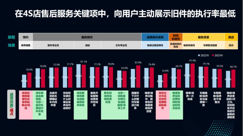 服务流程执行:新势力品牌整体执行率最高。服务关键项中向用户主动展示旧件的执行率最低。