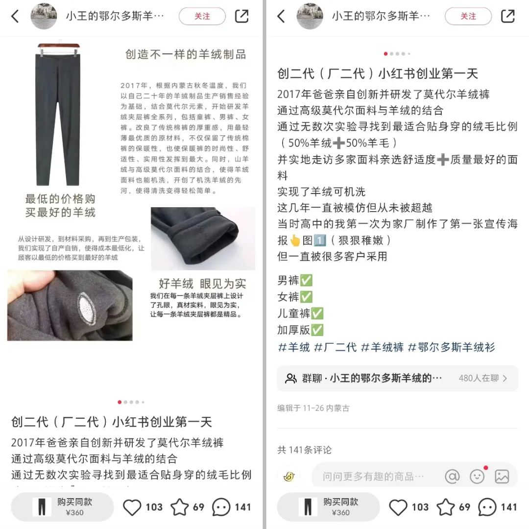 2023年11月,小王用小红书账号“小王的鄂尔多斯羊绒厂!”发了条笔记,内容是回忆爸爸在2017年研发的一条莫代尔羊绒裤,彼时还是高中生的小王,为家厂制作了第一张宣传海报,时隔5年再看,她的评价是:“狠狠稚嫩”,但一直被很多客户采用,几分傲娇在不经意间冒出了头。